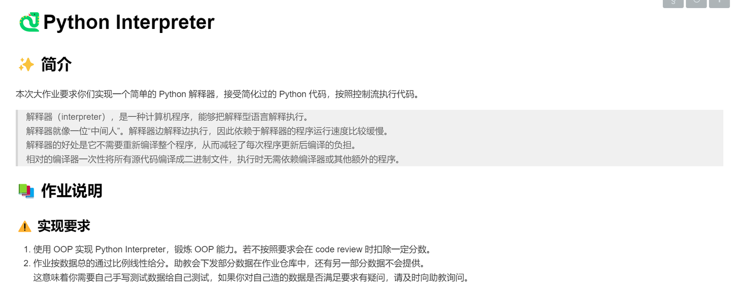 该项目是上海交通大学 ACM 班程序设计课程的大作业, 笔者通过助教的讲解与同学的帮助, 完成了 Python 解释器的核心代码. 大作业地址: https://github.com/ACMClassCourse-2022/Python-Interpreter-2022 实现方案: https://github.com/Conless/Python-Interpreter